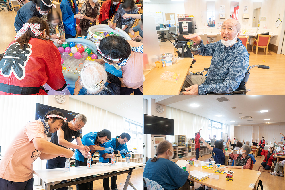 当日は、ヨーヨー釣りやあひるすくいなどの縁日コーナーをご用意し、利用者さんは童心に返ったように笑顔で楽しまれていました。