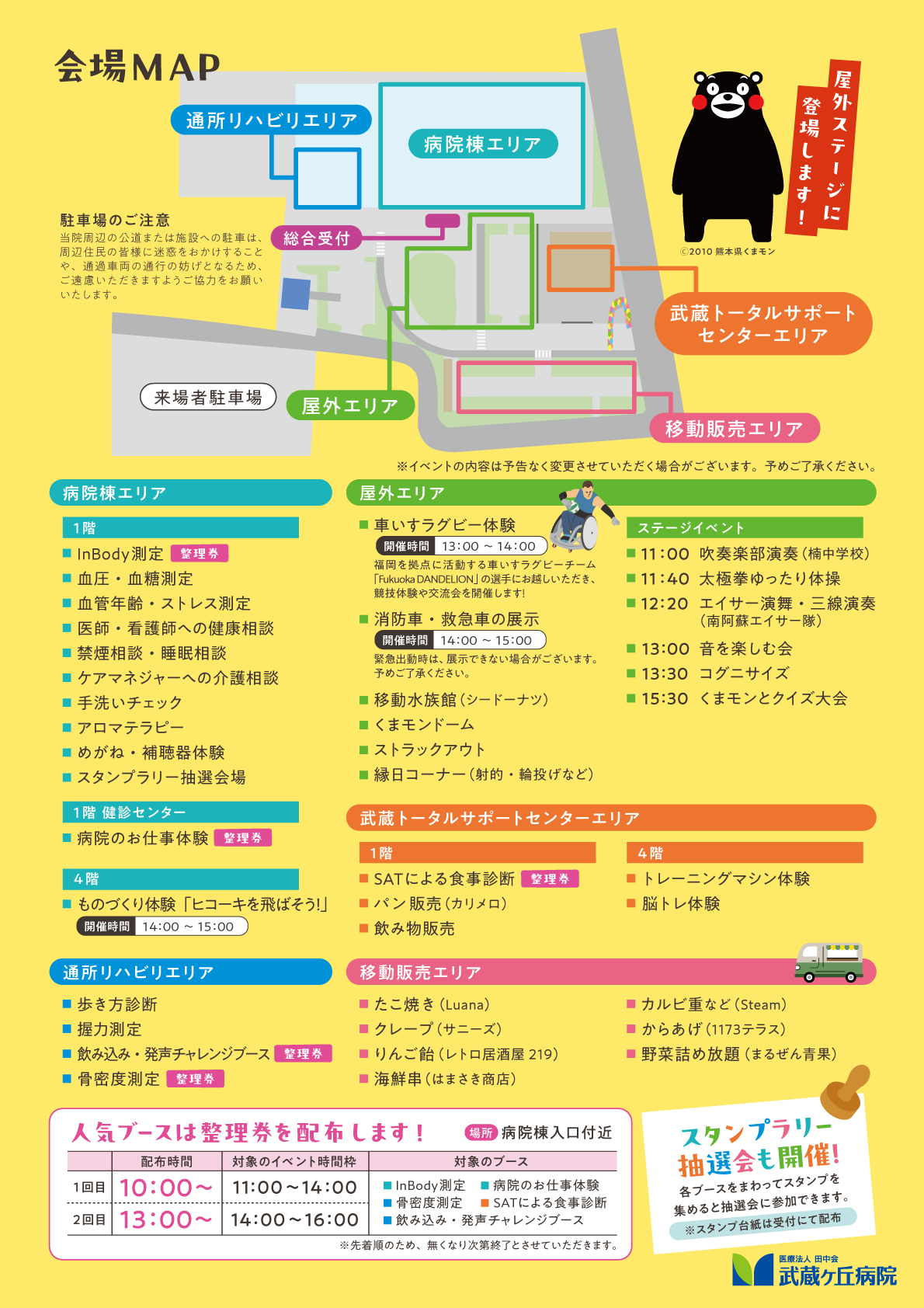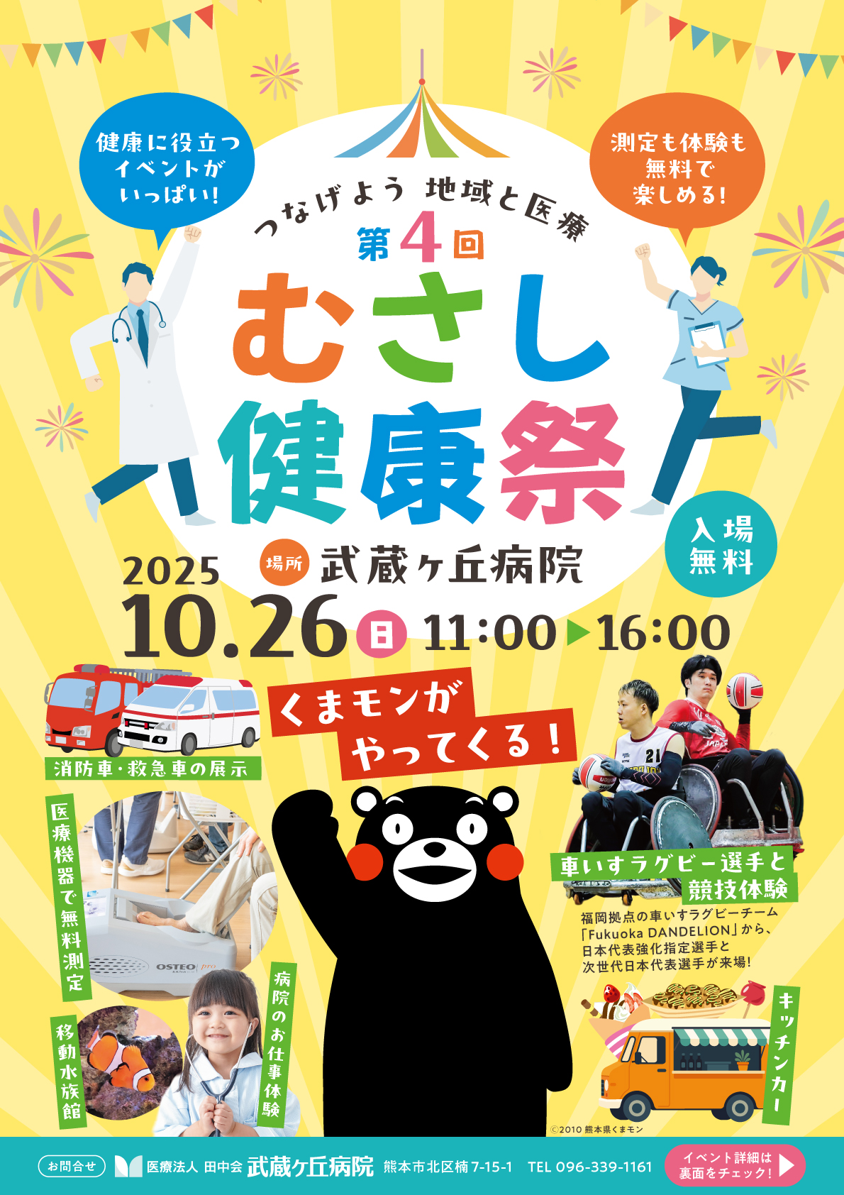 【主なプログラム】 健康コーナー:InBody測定、骨密度測定など ステージイベント:楠中学校吹奏楽部演奏、くまモンとクイズ大会など 体験コーナー:病院のお仕事体験、車いすラグビー体験など 屋外コーナー:消防車・救急車展示、移動水族館、くまモンドームなど