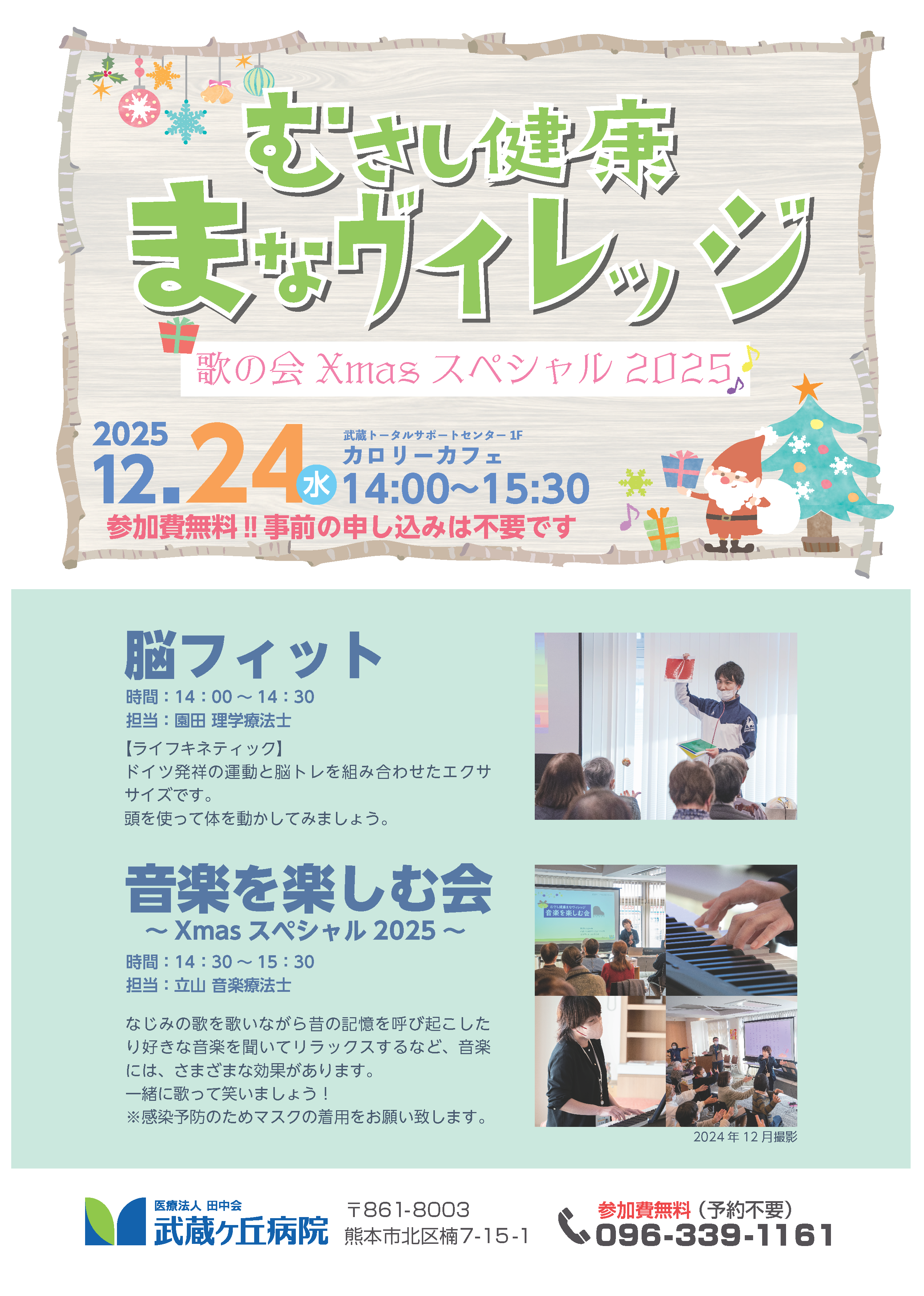12月むさし健康まなヴィレッジのご案内 2025.12.05 健康づくりに役立つ学びや体験ができるイベント「むさし健康まなヴィレッジ」を、12月も開催します!気軽に参加できる内容となっておりますので、ぜひこの機会にご一緒しませんか? 前のページに戻る