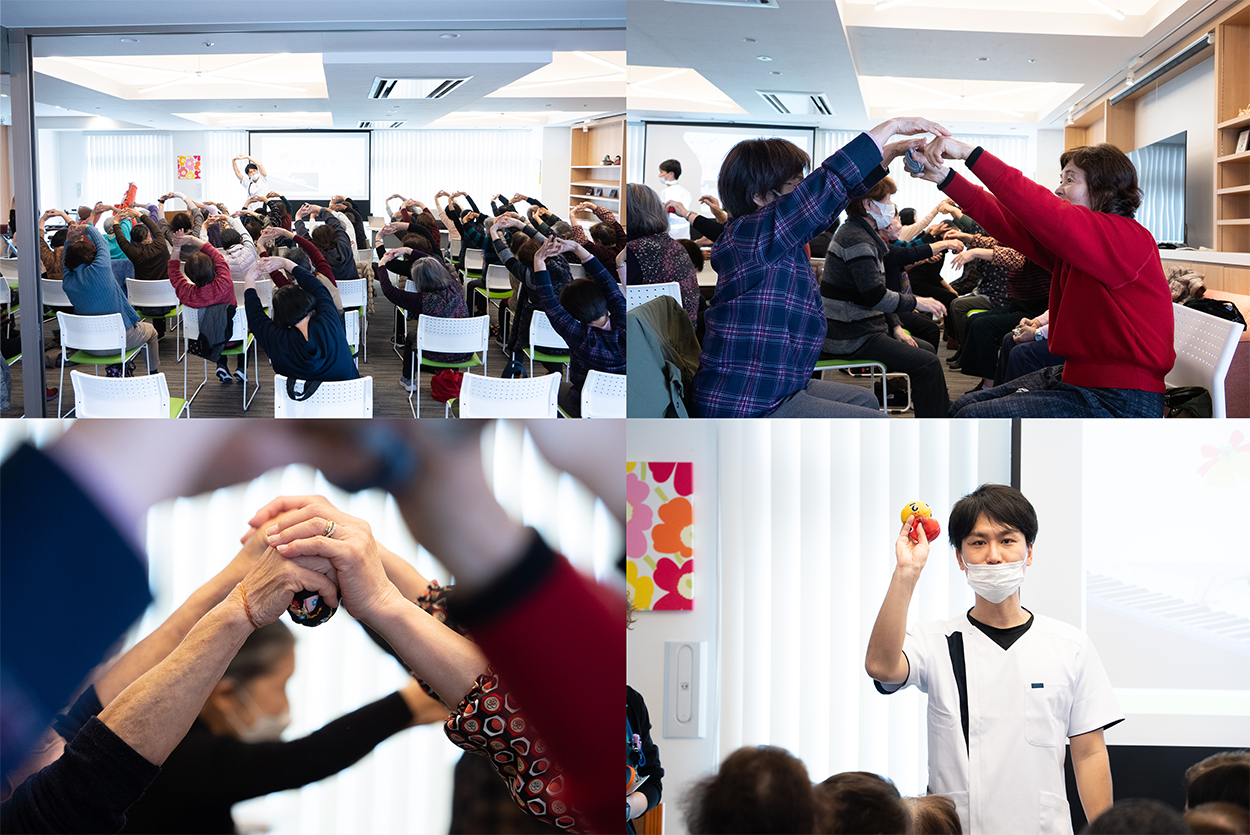 理学療法士の園田が担当し、ドイツ発祥の「運動と脳トレ」を組み合わせたエクササイズを行いました。 「あれ?難しい!」と笑い合いながら、頭と体を同時に動かすことで、脳に心地よい刺激を与える時間となりました。