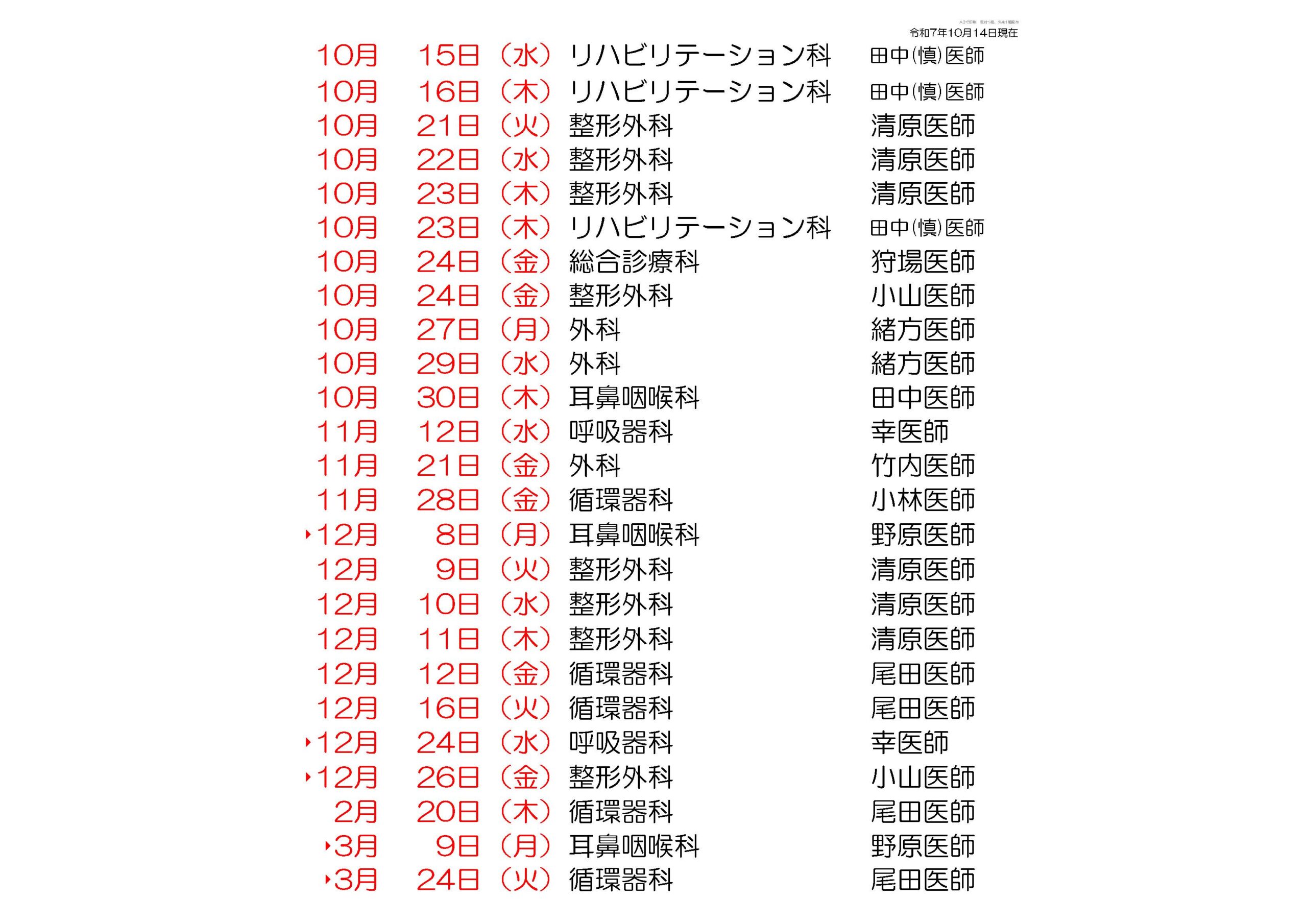 休診のご案内(10月、11月、12月~3月) 2025.10.05 大変ご迷惑をおかけいたしますが、以下については休診また ※以下のリスト以外でも事情により急遽、休診になることもございます。 ※ ‣のチェックマークは新規の休診の更新となります 前のページに戻る