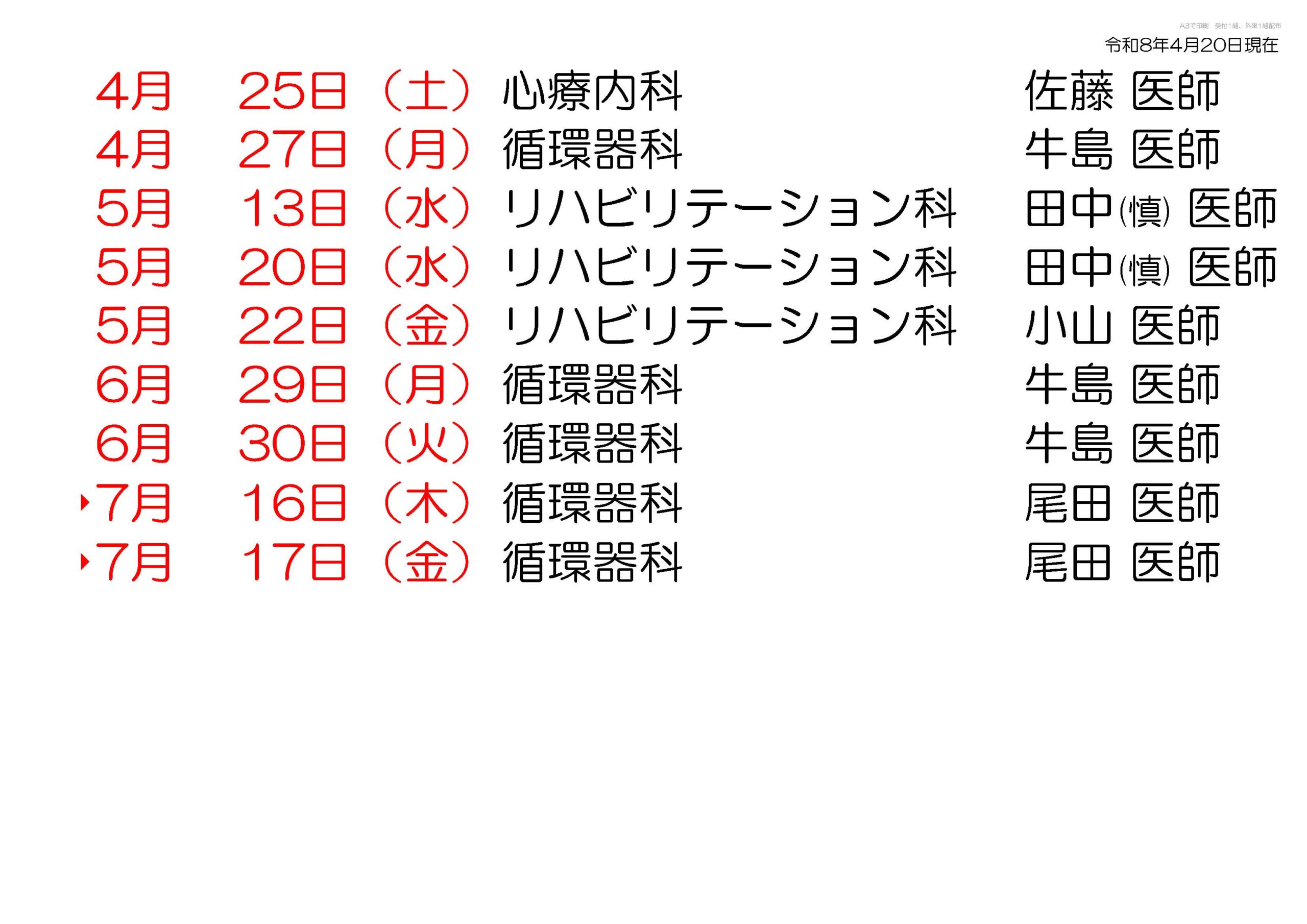 休診のご案内(4月~7月) 2026.04.20 大変ご迷惑をおかけいたしますが、以下の日程は休診となります。 ※以下のリスト以外でも事情により急遽、休診になることもございます。あらかじめご了承ください。 ※赤の‣マークは新規の休診になります 前のページに戻る